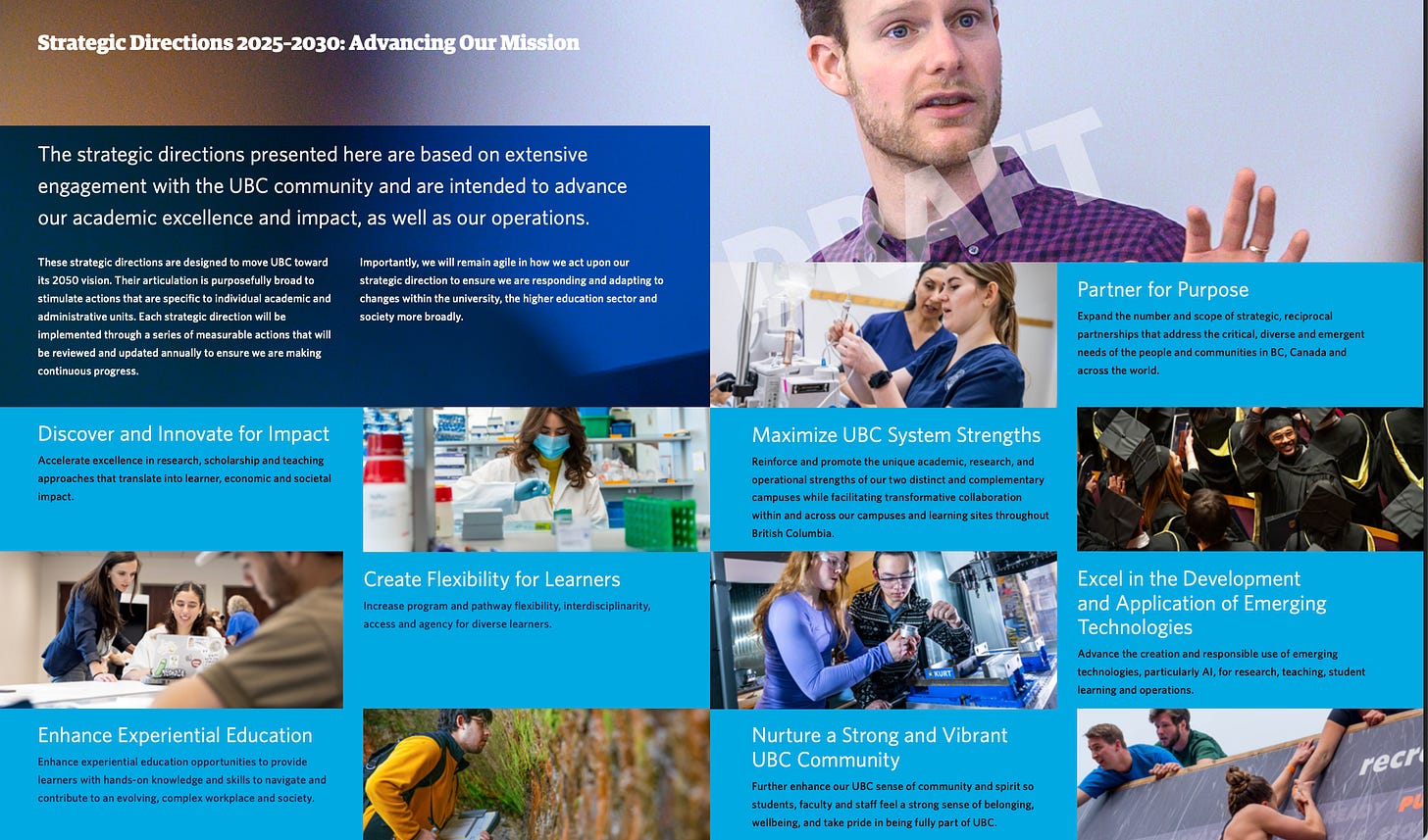 Posted above is the glossy summary page of the seven ‘strategic direction.’ It has been my experience that these plans have more impact in external relations then they do for grassroots faculty and staff. Yet such documents are not with effects on the base.