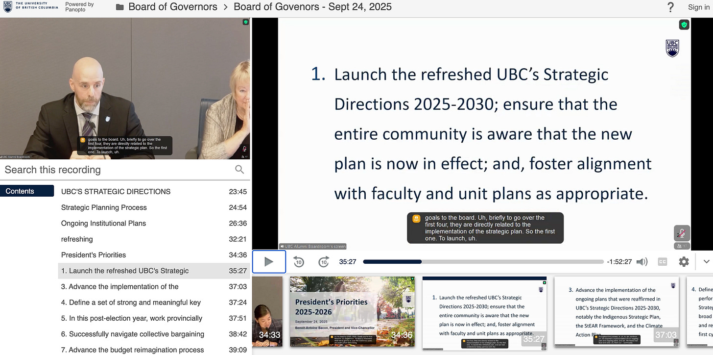 Four decisions where made during the UBC Board of Governors’ meeting, Wednesday September 24, 2025. Approval of the President’s priorities for the year, endorsement of the ‘strategic refresh,’ and approval of two major building projects, one at UBC-V, the other at UBC-O. Also heard in public session were presentations from the three student societies who represent UBC students.