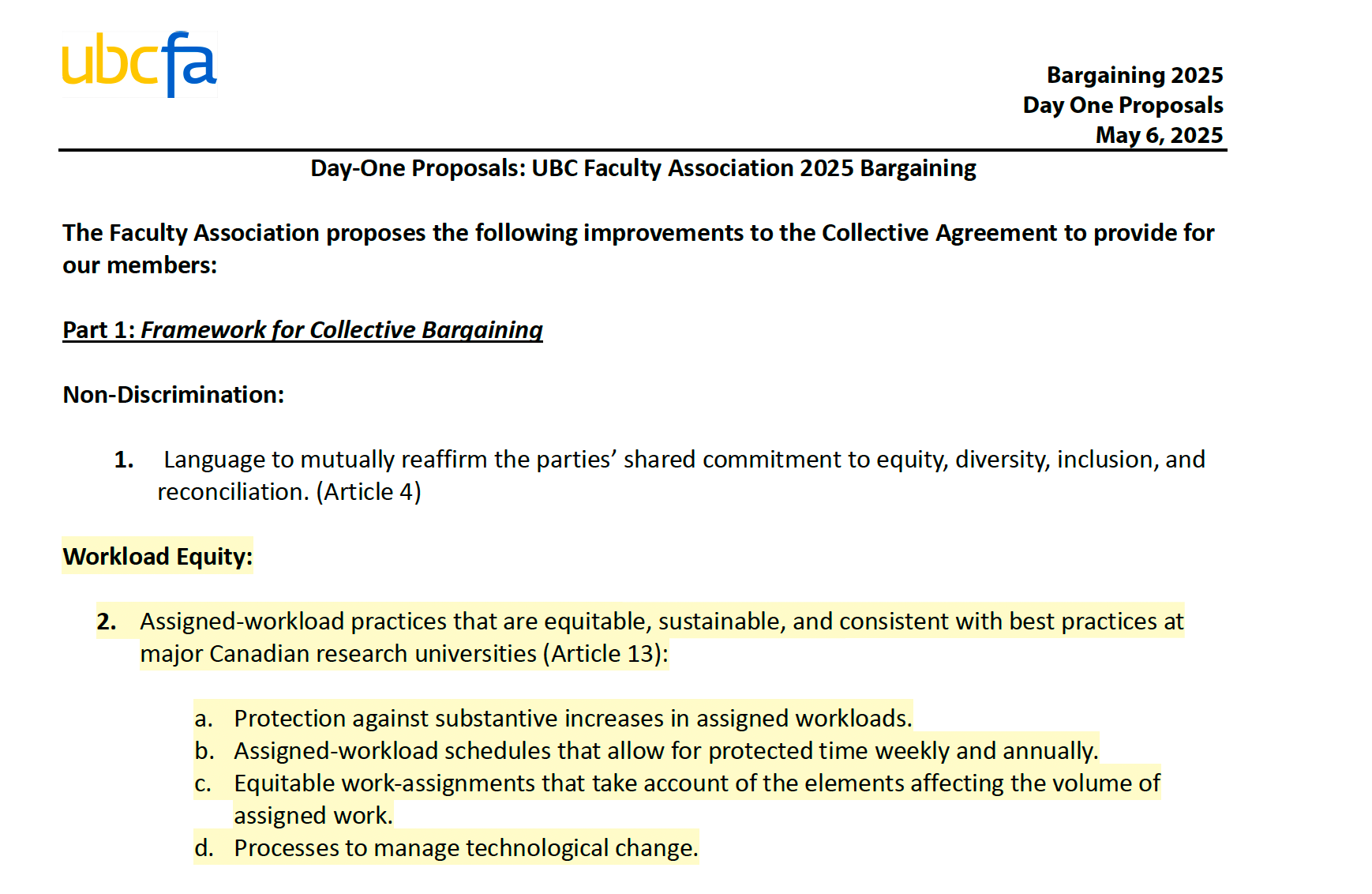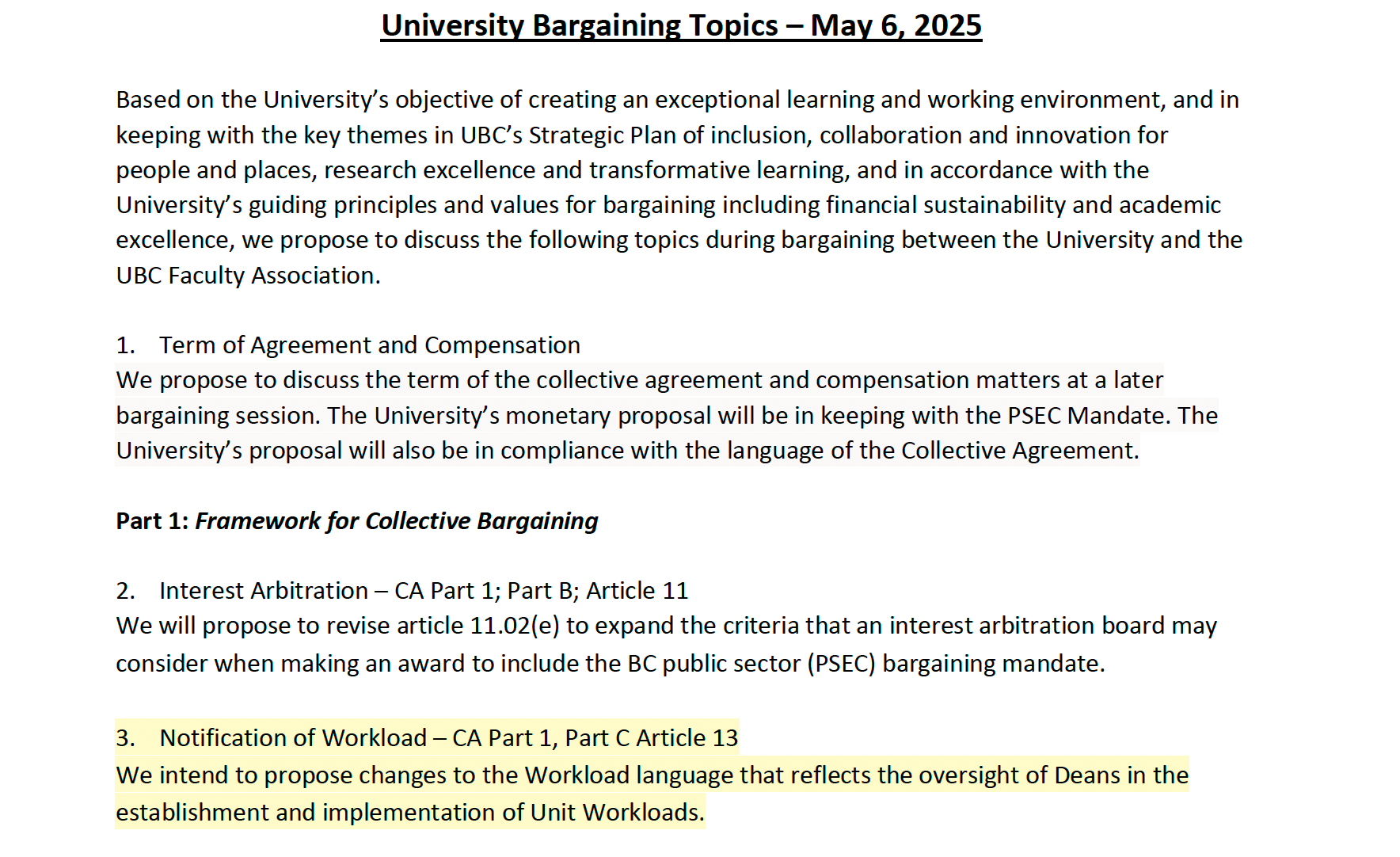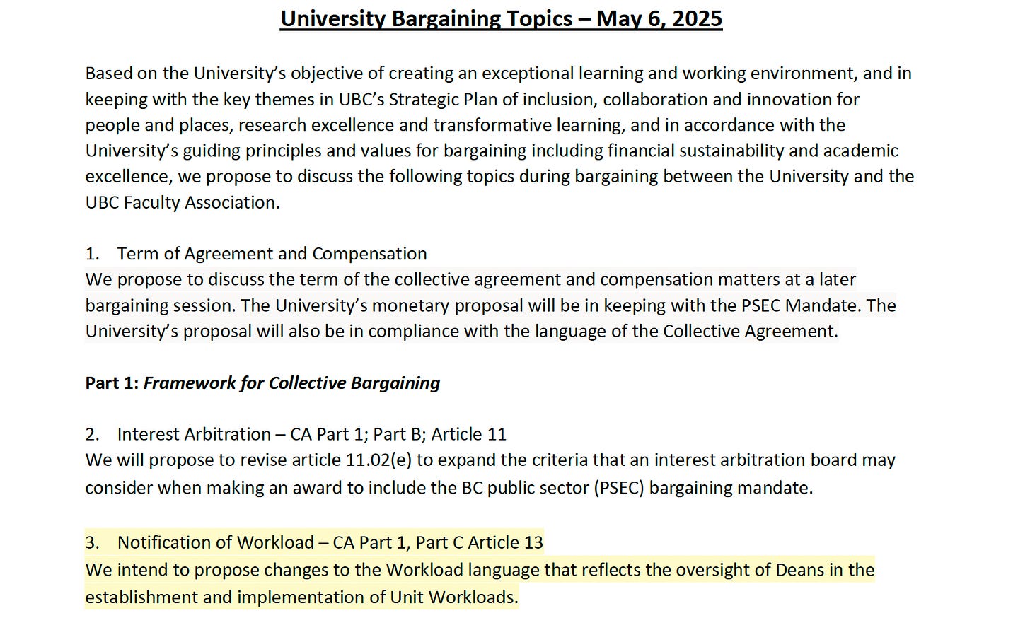 The current concern is tied to collective barging now underway. UBC’s Faculty Association is seeking greater equity in setting workloads. UBC’s Management wants the Dean’s managerial role codified. Both parties are seeking changes and clarifications.
